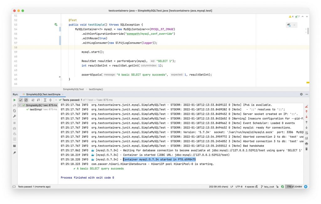 For those of you who love screenshots of IDEs (we do! Unless that’s an issue report on GitHub 😅), here is an example of an end-to-end test that uses MySQL that finishes in less than two seconds, out of which only ~650ms were spent starting MySQL with Testcontainers, and the rest is the MySQL JDBC client initialization and executing the test query: