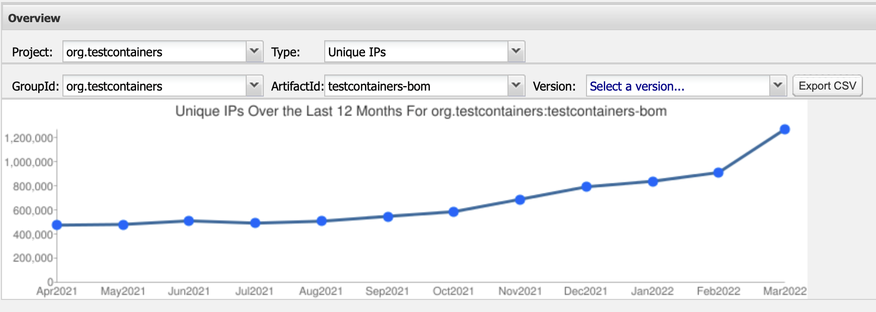 And, before you say “this +50% in March must be some ephemeral CIs downloading it over and over”, have a look at this chart of unique IPs (hint: public CIs have a fixed range of IPs):