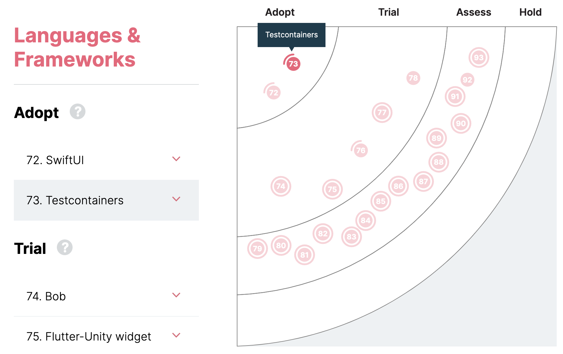 Also, besides the growing raw download numbers Testcontainers is getting excellent feedback from thought leadership giants in the industry. The latest release of the Technology Radar by Thoughtworks puts Testcontainers into the great company of technologies you should adopt.